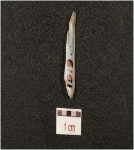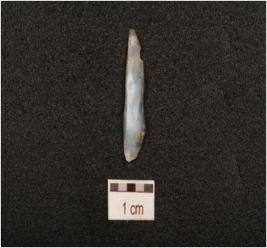 | Description / विवरण | A chalcedony blade with mid ridge on dorsal, bulb on ventral, striking platform, triangular cross section and broken along distal end. |