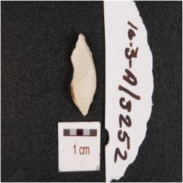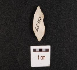 | Description / विवरण | Fragment of chert utilized flake, scars on both side, smooth surface and use-marks along working edge. |