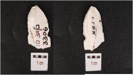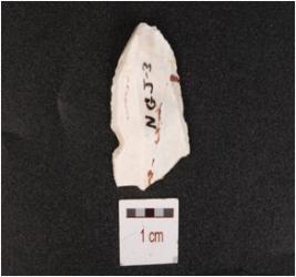 | Description / विवरण | A utilized flake made on chert, prominent bulb on ventral and irregular edges. |