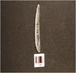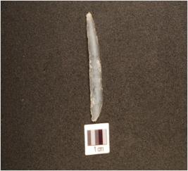 | Description / विवरण | A chalcedony blade with prominent mid ridge on dorsal, trapezoidal cross-section and use-wear marks on cutting edge. |