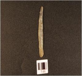| Description / विवरण | A chalcedony blade with double ridge on dorsal, prepared platform, bulb on ventral, trapezoidal cross-section and use-wear marks on cutting edge. |