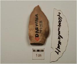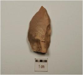 | Description / विवरण | Fragment of flake made of chert, flake scars on the surface. |