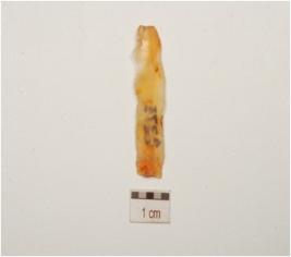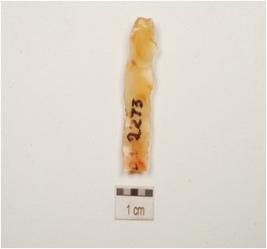 | Description / विवरण | A chalcedony blade with mid ridge on dorsal, striking platform, bulb on ventral, use wear marks on cutting edge and broken along distal end. |