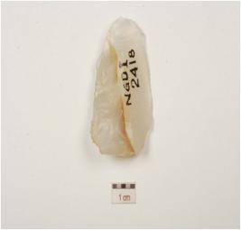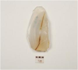 | Description / विवरण | A chalcedony scraper with flake scars and ripple marks on surface, prepared platform, bulb on ventral and use wear marks on working edges. |