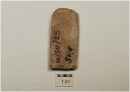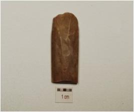 | Description / विवरण | A flake made on chert blade scars on dorsal side, broken along one side. |