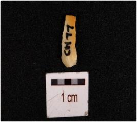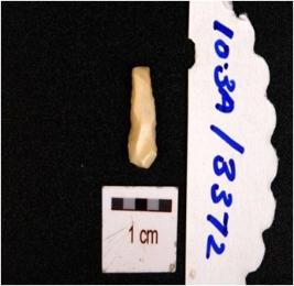 | Description / विवरण | A chert blade, flake scars on the surface, diffused bulb on ventral side, prepared platform on the proximal end, distal end intact and sharp cutting edges. |