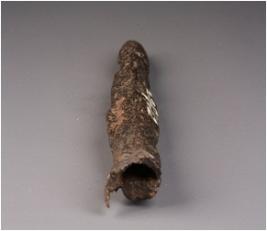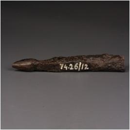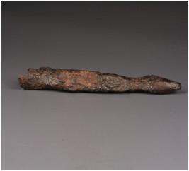 | Description / विवरण | Fragment of copper spear point, square section, rough surface, four edges and tanged, tip of the spear point is conical, the middle portion is thicker and socketed. |