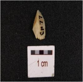 | Description / विवरण | A chalcedony utilized flake, made on end struck flake, diffused bulb on ventral side, flake scars on the surface. |