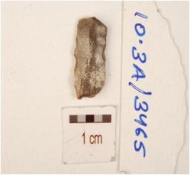 | Description / विवरण | Fragment of chert blade with prominent mid ridge on dorsal, triangular cross section and use wear marks on cutting edge. |