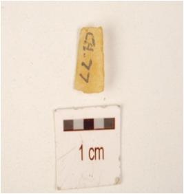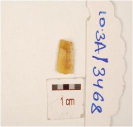| Description / विवरण | Fragment of chalcedony blade with double ridge on dorsal, trapezoidal cross section, both ends broken and use wear marks on cutting edge. |