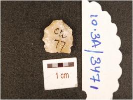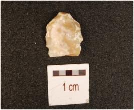 | Description / विवरण | Fragment of chalcedony blade, prominent mid ridge on dorsal, prepared platform, bulb on ventral and use wear marks on cutting edge, broken distal end. |
