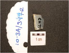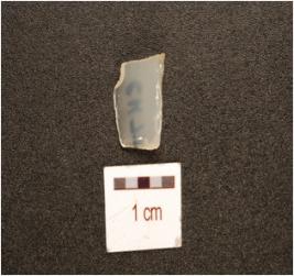 | Description / विवरण | Fragment of chalcedony backed blade with use wear marks on cutting edge. |