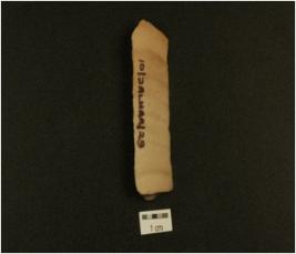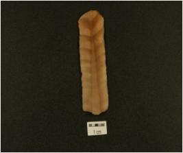 | Description / विवरण | A blade made on chert distal end in broken diffused bulb on ventral side on the proximal end and mid ridge on dorsal side, irregular retouching marks on edges. |
