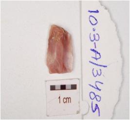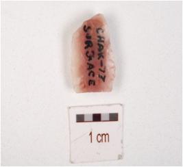 | Description / विवरण | Fragment of chalcedony blade with triangular cross section, use wear marks along the cutting edge and bulb absent. |