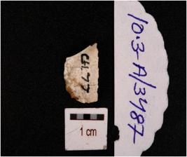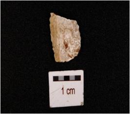 | Description / विवरण | Fragment of chert blade with use wear marks along the cutting edge, prepared platform and prominent bulb on ventral side. |