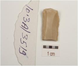 | Description / विवरण | A blade fragment made on chert with a mid ridge on dorsal, trapezoidal cross-section and wear marks along the working edges, diffused bulb on ventral. |