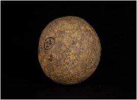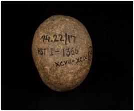 | Description / विवरण | Stone sling ball with some rough surface, intact in nature. |