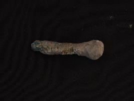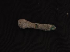 | Description / विवरण | Trench BX-1, LXB-D 1.60 mtrs x 3 mtrs - 4.14 mtrs at peg B1, Stratum Layer 18 This is a nail made of copper alloy. It is narrow at the tip end and on the other end. There is a hammering tip. It is damaged at the both margins or ends. Appearance is of green or muddy. Hard patina with dust and dirt deposited on it. |