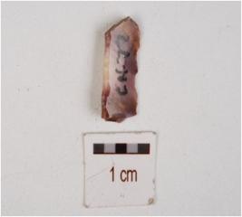 | Description / विवरण | A chert blade, flake scars on the surface, prepared platform on proximal end, use wear marks on the cutting edges. |