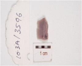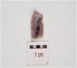 | Description / विवरण | A chert blade, flake scars on the surface, prepared platform on the proximal end, partly retouching on the cutting edge. |