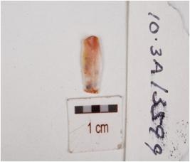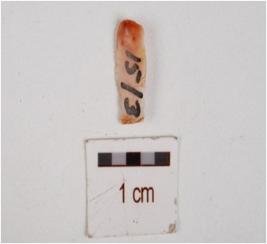| Description / विवरण | A chalcedony blade with flake scars on dorsal, prepared platform on the proximal end, use wear marks on cutting edges. |