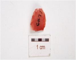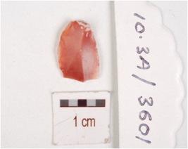| Description / विवरण | A carnelian blade, flake scars on the surface, prominent bulb on ventral side, prepared platform on proximal end, use wear marks on cutting edges. |