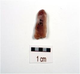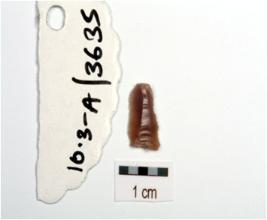 | Description / विवरण | Fragment of a blade on chalcedony, two ridges on dorsal, trapezodial cross-section and use marks along cutting edges. |