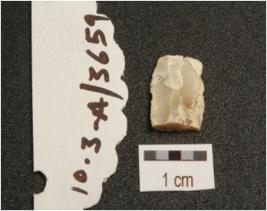 | Description / विवरण | Fragment of parallel sided blade made on chalcedony, use wear marks along with cutting edges, two ridges on dorsal and trapezoidal cross-section. |
