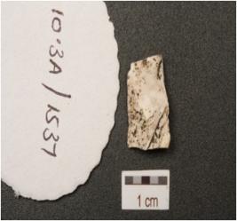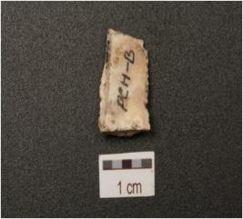 | Description / विवरण | A chalcedony blade, flake scars and cortex on the surface, use marks on the cutting edges and prepared platform on the proximal end. |