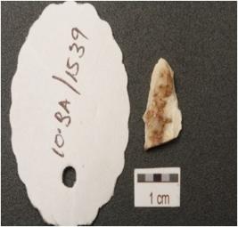 | Description / विवरण | A flake made of chalcedony with flake scars and cortex on the surface and prepared platform on the proximal end. |