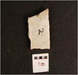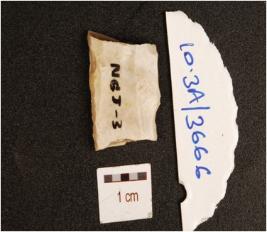 | Description / विवरण | Fragment of chert blade with double ridge on dorsal, retouches on cutting edge and trapezoidal cross section. |