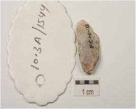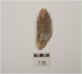 | Description / विवरण | A utilized flake made of chert and flake scars on the surface and use marks on edges. |