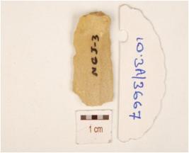 | Description / विवरण | A chert blade with double ridge on dorsal, trapezoidal cross section, prepared platform on proximal end, bulb on ventral and use wear marks on cutting edge. |