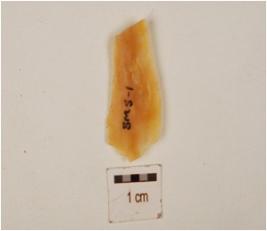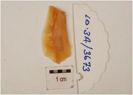 | Description / विवरण | A chalcedony blade with double ridge on dorsal, trapezoidal cross section and use wear marks on cutting edges. |