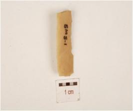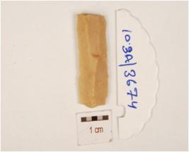 | Description / विवरण | A chert blade with prominent mid ridge on dorsal, triangular cross section, use wear marks on cutting edges and broken distal end. |