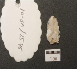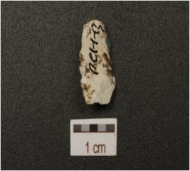 | Description / विवरण | Fragment of chalcedony blade, flake scars on the surface, diffused bulb on the ventral side, prepared platform on the proximal end and use marks on the cutting edges. |