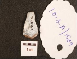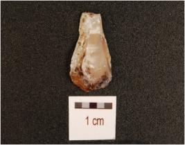 | Description / विवरण | A blade made on agate, has double ridge, three flake scars on dorsal, irregular edges and diffused bulb on ventral. |