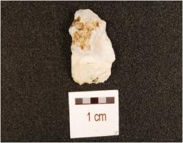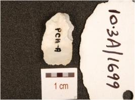 | Description / विवरण | A chert utilized flake with flake scars on dorsal, striking platform, bulb on ventral and use-wear marks on working edge. |