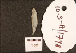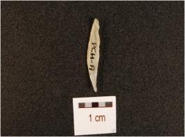 | Description / विवरण | A knife blade made on chalcedony, mid-ridge on dorsal irregular edges and diffused bulb on ventral surface. Painted along one end. |