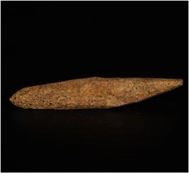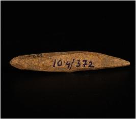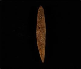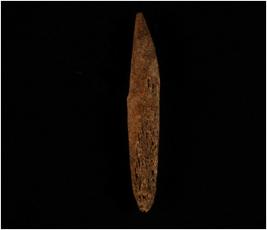 | Description / विवरण | A Bone Point made of bone with pointed ends, rough surface and several ridges visible. |