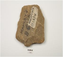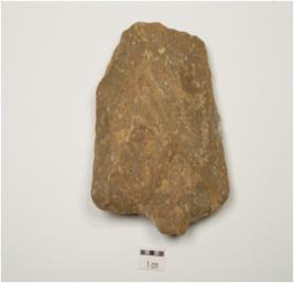 | Description / विवरण | Fragment of quartzite scraper, flake scars on ventral side, wavy cutting edges and broken on other end. |