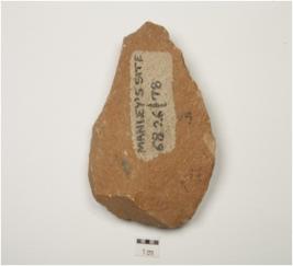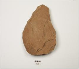 | Description / विवरण | A handaxe made on quartzite with flake scars on dorsal side, bulb of percussion on ventral side, prepared platform on posterior and wavy cutting edges. |