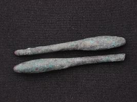 | Description / विवरण | Stratum These are two pieces of an antimony rods of copper. It seems to be used as tool. Surface of the object is rough and uneven. Colour of the object is greenish black due to patina presence. |