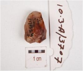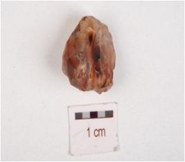 | Description / विवरण | Fragment of a core made on chalcedony, two blade and flake scars on surface. |
