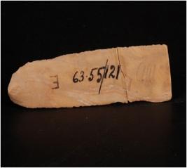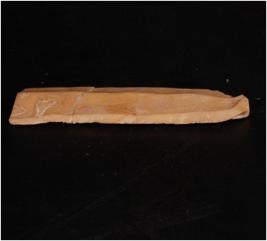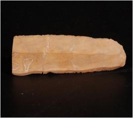 | Description / विवरण | A Parallel sided Blade made of Chert with a mid-ridge, broken along the proximal end, use-wear marks along the cutting edges and bulb on ventral side. |