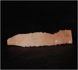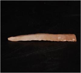| Description / विवरण | A Parallel side blade made of Chert with a mid-ridge on dorsal side, broken at proximal end and bulb on the ventral side. |