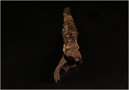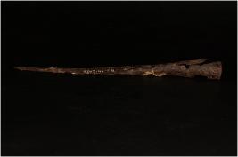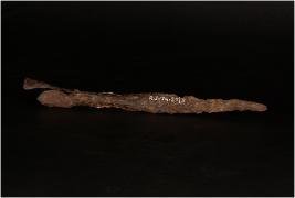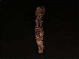 | Description / विवरण | A Iron hoe, partly broken, flat from one side, hollaw handle, pointed end, rough surface, Rusted. |