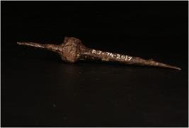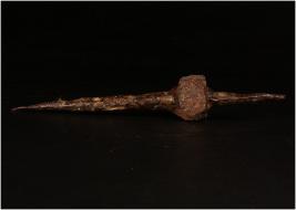 | Description / विवरण | A Iron drill, thin rod, pointed ends, circular portion in the middle, rusted. |