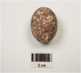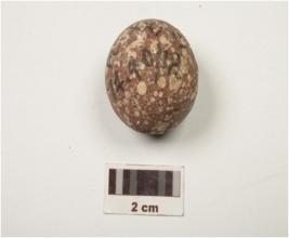 | Description / विवरण | A small sling ball made of red sandstone, round in shape, white pigmentation on surface and smooth surface. |