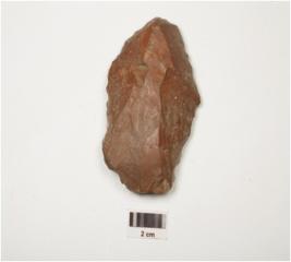 | Description / विवरण | Scraper made on jasper with flake scars on dorsal and diffused bulb on ventral, retouched marks along cutting edges. |